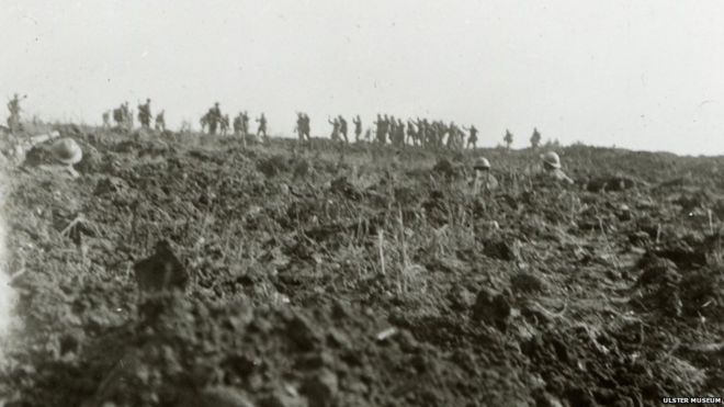 'Photograph taken during the Battle of the Somme'- Shows German soldiers surrendering as an opposing devision advances towards them. https://ichef-1.bbci.co.uk/news/660/media/images/78991000/jpg/_78991366_7444685-high-.jpg